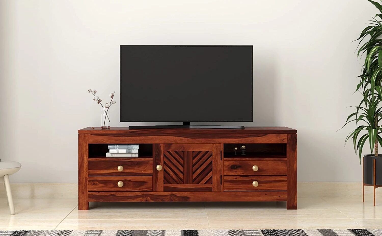 Home Storage TV Units Pipercrafts Solid Sheesham Wood TV Unit with Drawer Honey Finish